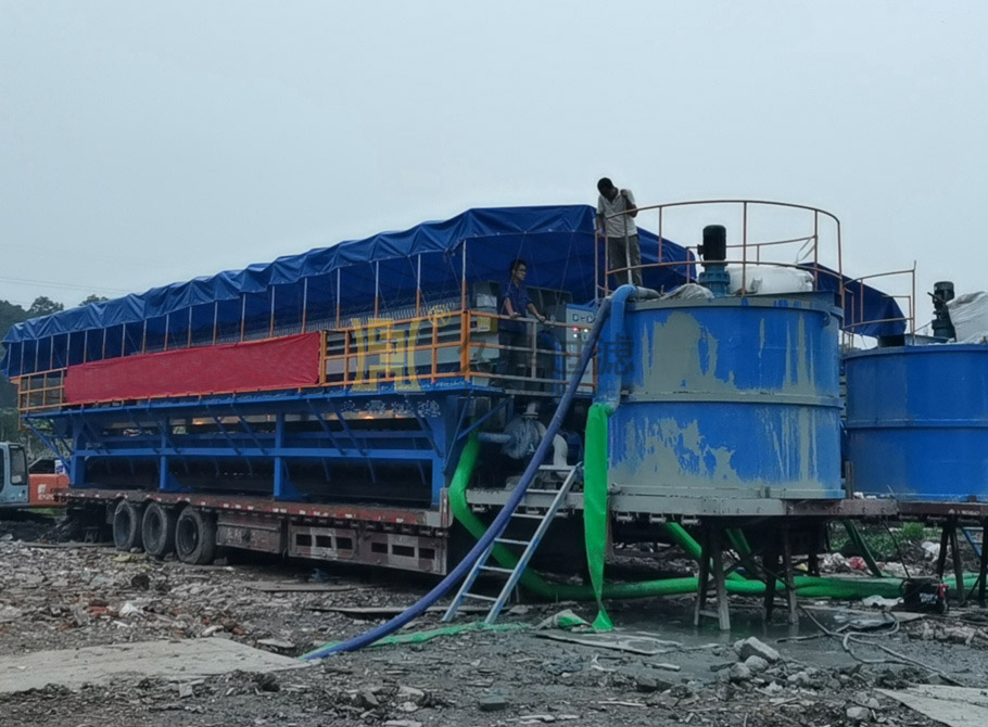 打樁建筑、隧道、盾構(gòu)、環(huán)境污染污水應(yīng)急處理等工程施工中所產(chǎn)生的廢棄泥漿或污水現(xiàn)場(chǎng)脫水;對(duì)施工產(chǎn)生的廢棄泥漿進(jìn)行現(xiàn)場(chǎng)脫水處理,形成泥餅與清水,使原來(lái)的廢棄泥漿外運(yùn)排放改變?yōu)樵镣膺\(yùn)處置,分離出的清水能全部回收用;壓濾機(jī)放置于17.5的平板車(chē)上,便于工地轉(zhuǎn)場(chǎng)施工。
